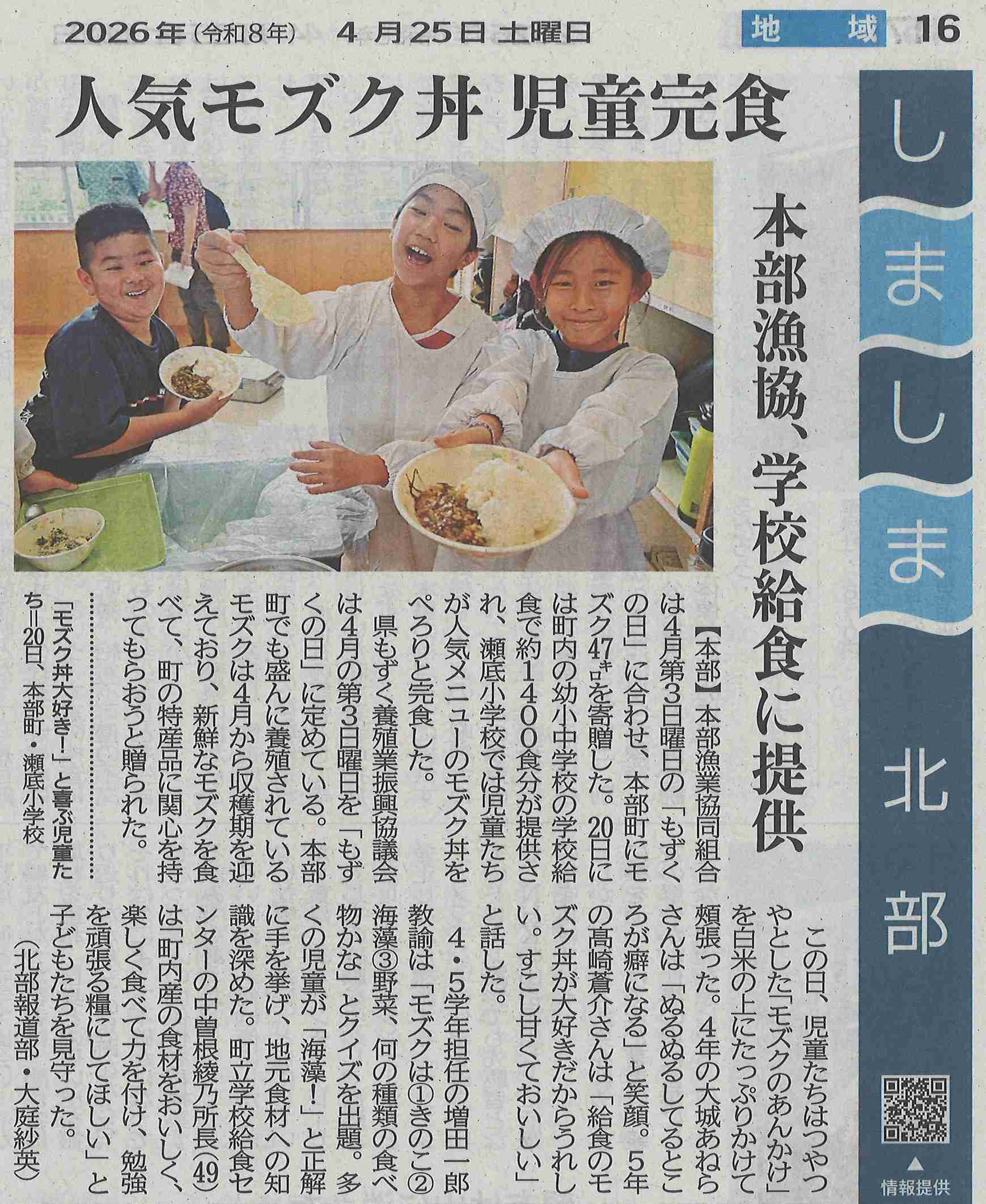 4月25日(土)付けの沖縄タイムスで本校の給食の様子が紹介されました。